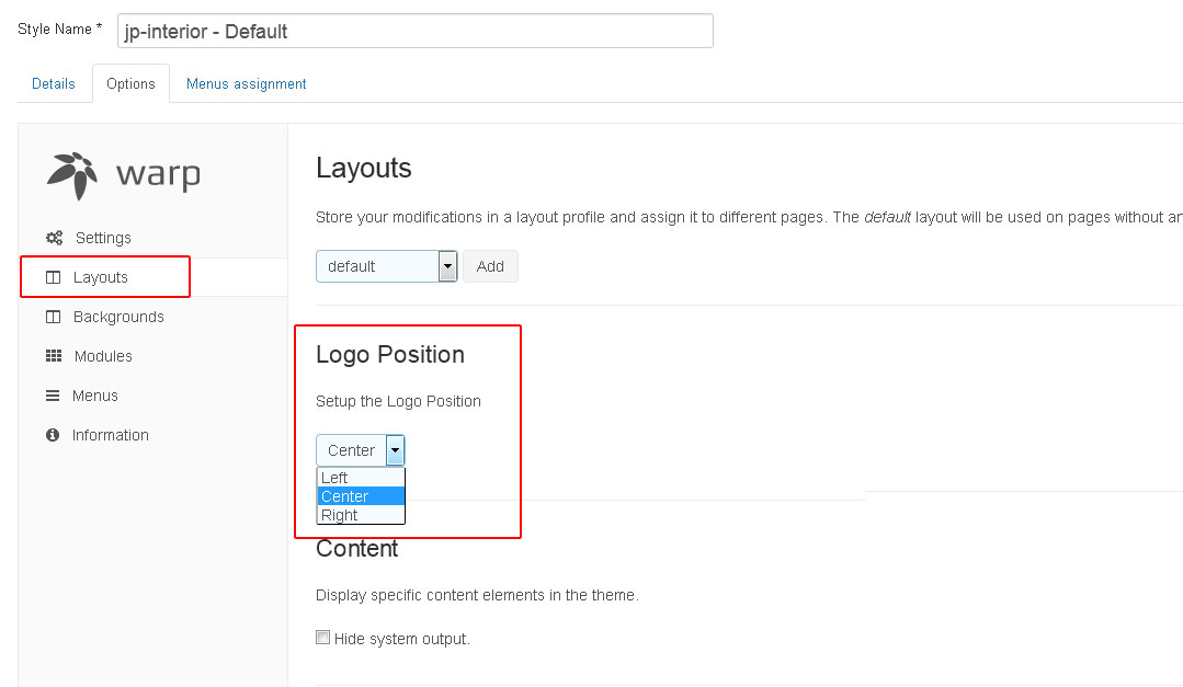 Each section, where the modules are stored can have their own background image, font and link color. The section configuration can be done from backend, see image below
